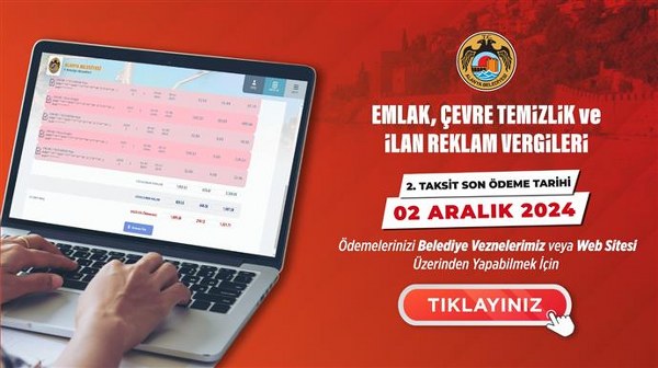 Alanya Belediyesi, Emlak Vergisi, Çevre Temizlik Vergisi, İlan Reklam Vergisi 2. taksiti ve 7440 Sayılı Kanun kapsamında yapılandırılan borçların 18. taksit ödemelerinin 2 Aralık 2024 Pazartesi günü mesai saati bitimine kadar yapılması gerektiğini duyurdu.